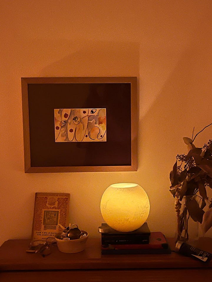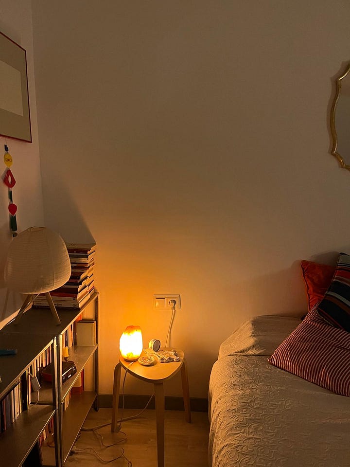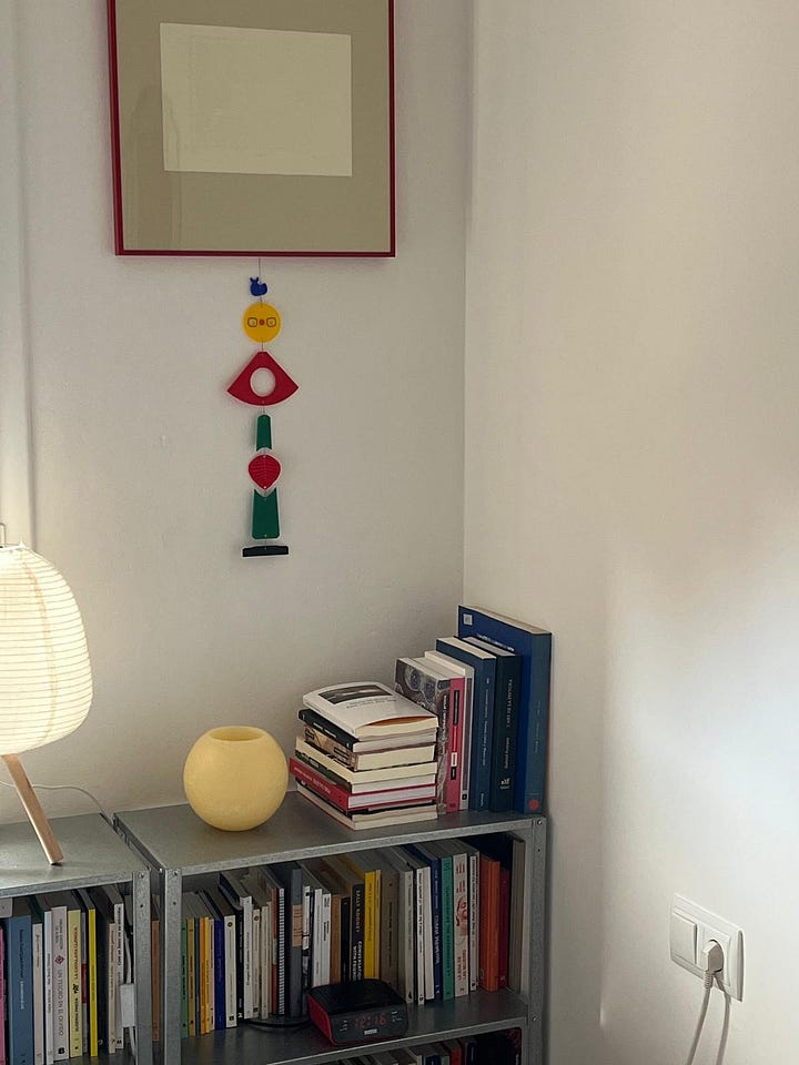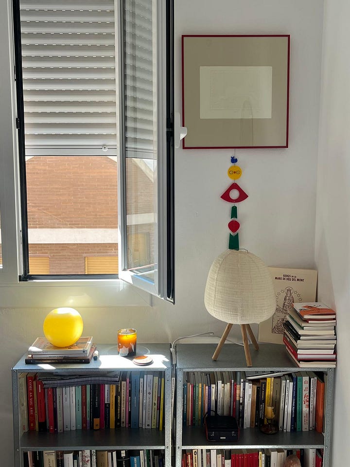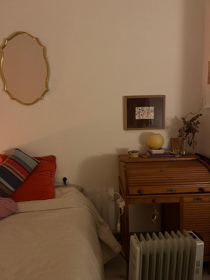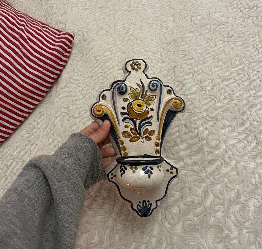 Aquesta història és meta-substack perquè la meva mare va llegir el post sobre les piquetes baptismals i em va dir que en tenia una. Que l’havia comprada a Andalusia, fa força temps. I que (alerta!) me la donava. La veritat és que sembla feta expressament per a la meva habitació, però encara no l’he collada a la paret perquè tinc dubtes d’on fer-ho. Pot anar al cantó esquerre del llit, a sobre l’interruptor, i sota la tauleta de nit petita que tinc al costat dels llibres o al cantó dret, prop de l’escriptori antic i l’aquarel·la que em va fer el meu pare que el dia que vaig néixer (que estaria 100% en el Top 5 d’objectes preferits de la meva existència sencera). En tots dos casos, hi posaré els anells i les arracades que em tregui abans d’anar a dormir. Em podeu ajudar a decidir on la penjo???