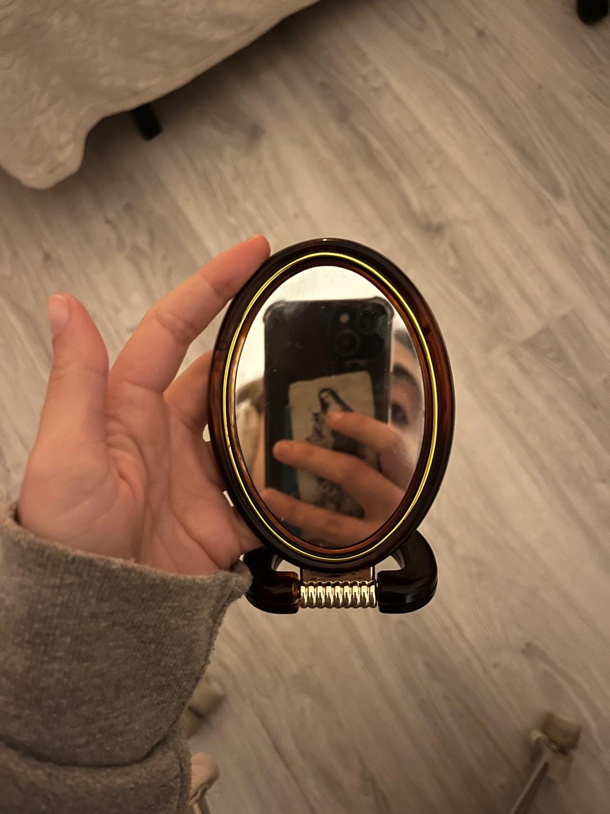 Però tornem al mirall, l’objecte guanyador. Jo volia anar a la sample sale de Paloma Wool (és a dir, a casa l’àvia de la meva amiga Mercè) perquè se m’havia dit que hi hauria molts miralls. I em va encantar poder-me endur aquest petit mirallet portàtil, amb una lent d’aquestes que fa zoom i així pots veure’t bé totes les tares. Té un suport per a mantenir-se dret ell solet, però també es pot plegar, i el mateix peu del mirall és un mànec per si vols agafar-lo amb les mans. És de pasta marró i té un rivet daurat. Té forma d’oval, com els mirallets dels contes infantils. És el mirall perfecte.