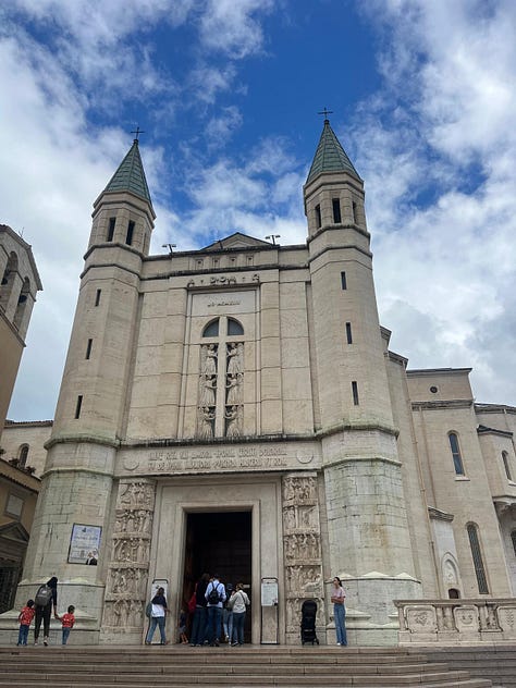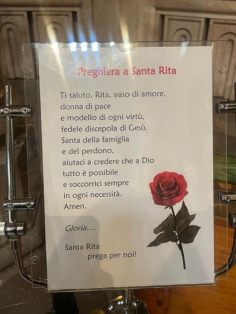 I ja per acabar, el Moment Opus Dei abans de tancar l’any. Ja us he parlat del viatge a Itàlia que vaig fer amb l’Eugènia, però no sabeu que hi vaig anar amb l’excusa que ella m’acompanyaria al santuari de Santa Rita, a Càssia, on la santa va morir i s’hi conserva el seu cos incorrupte. És un lloc molt kitsch on hi havia gent de Vox fent peregrinatge, d’acord? Però la història de Santa Rita m’ha fascinat tota la vida per raons òbvies (un dia li dedico un post si voleu) i em feia il·lusió anar-hi i ja de pas fer el que es fa a Itàlia: plorar veient edificis i menjar de puta mare.