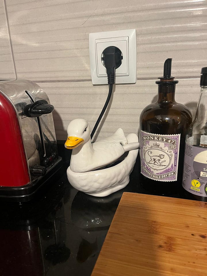 4.1. Un ànec enfadat. Em va fer gràcia i vaig endur-me cap a casa aquest ànec de ceràmica amb una cullera sense saber gaire per què l’utilitzaria. Ha acabat sent el recipient on hi guardo el cafè mòlt.
